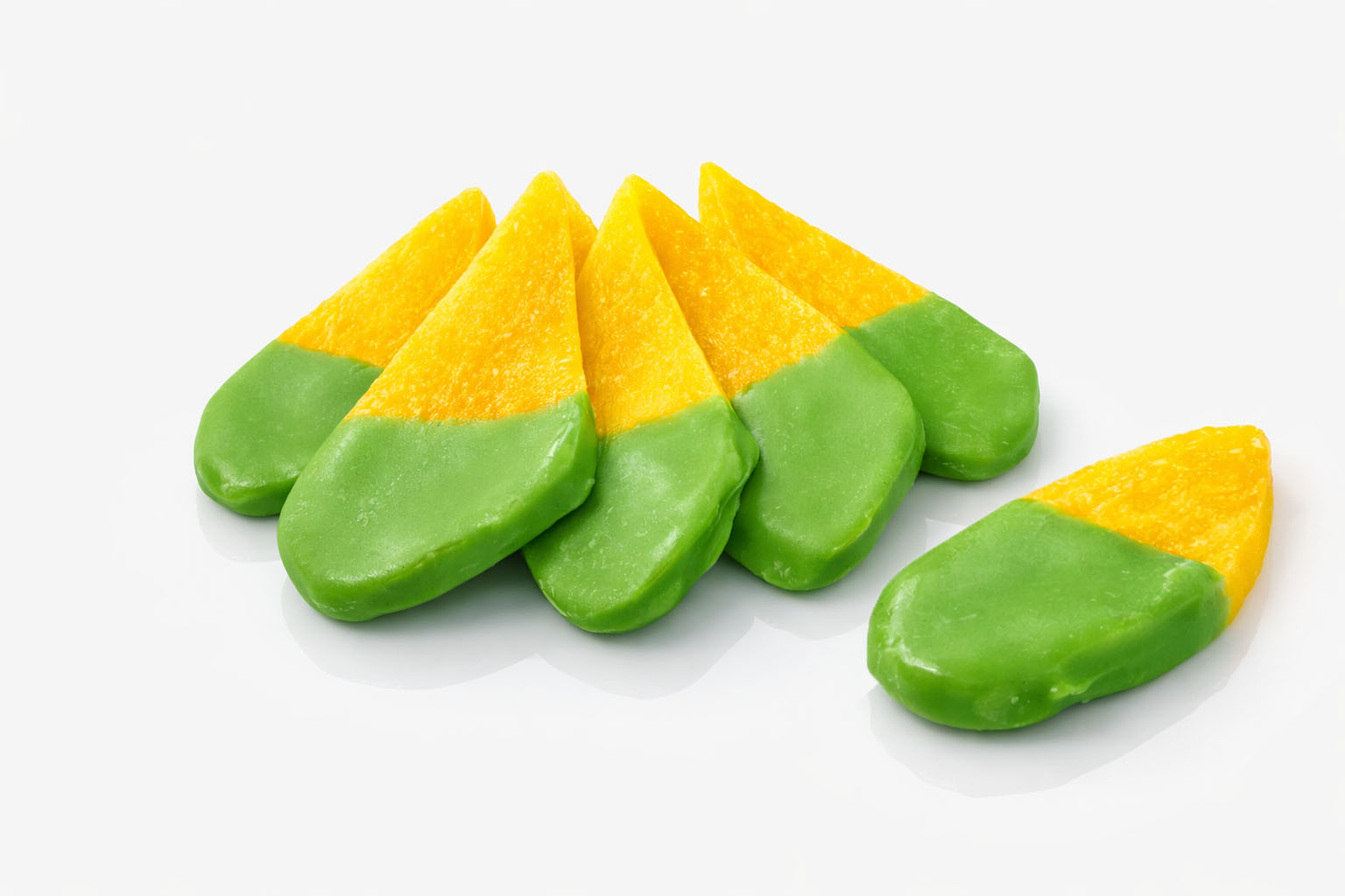 An adventurous pairing where the creamy, grassy umami of matcha green tea meets the sharp, sun-drenched acidity of dried mango. This combination offers a unique sensory journey from the soft, botanical coating to the dense, chewy, and honey-sweet fruit core, delivering a refined and unconventional tropical treat.